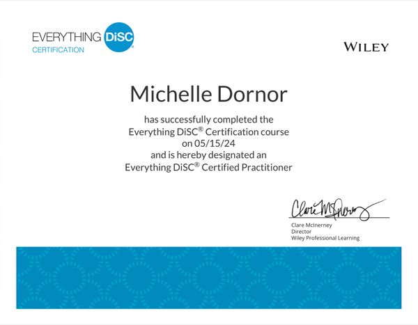 In Everything DiSC, Michelle is the (iS) DiSC style. Michelle loves conversation but places higher value on taking action (not common for an iS style!) and thrives in environments that are positive, warm, and inclusive while demonstrating a dynamic, enthusiastic, collaborative, and supportive people first mindset.